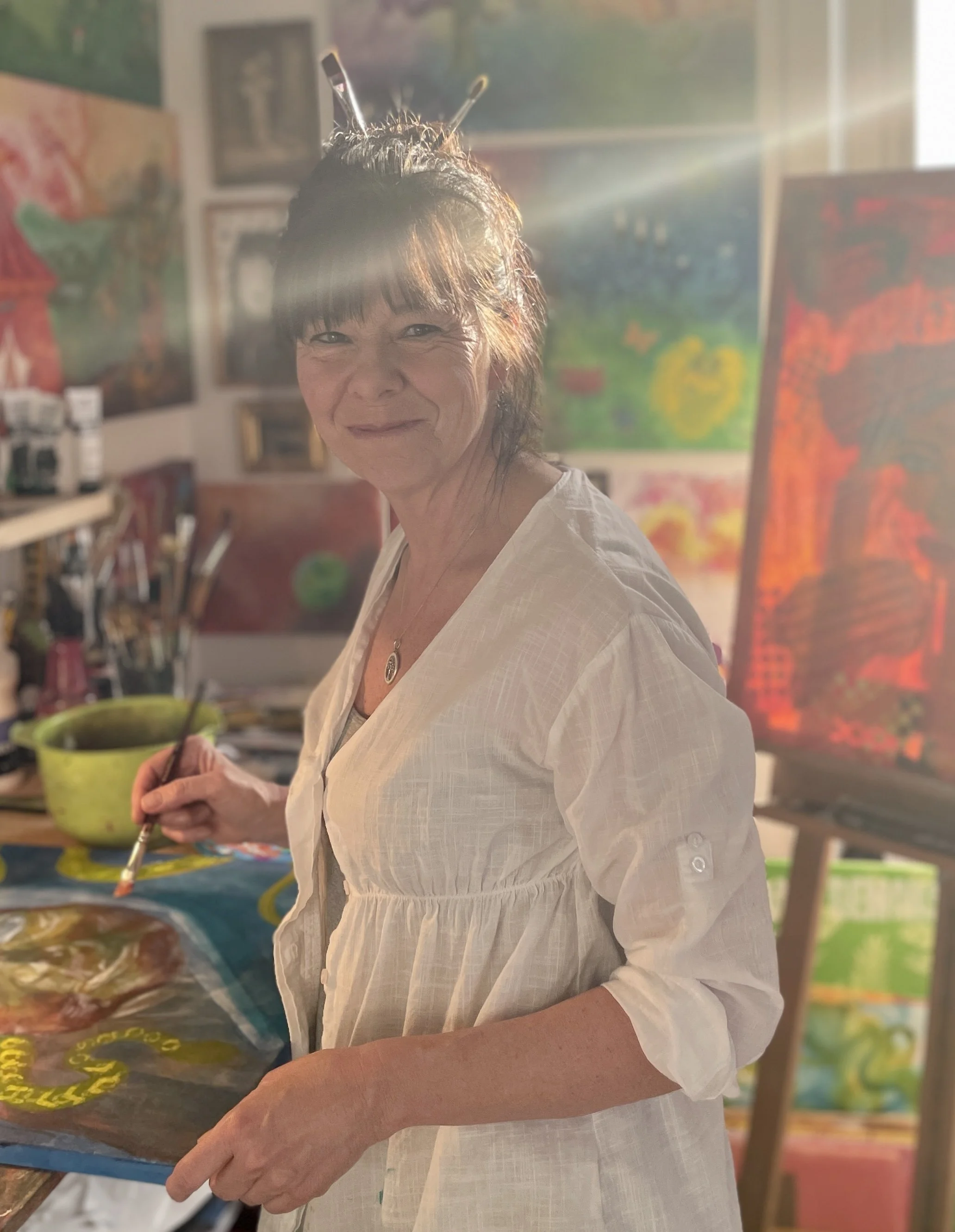 Färgerna är viktigast för mig. Massor av färg. Att måla intuitivt, lekfullt och med en nyfikenhet till vad som dyker upp härnäst är min passion. Ofta kan jag ha en idé om ett motiv, men det slutar oftast i något helt annat. I mitt målande får jag utlopp för mina känslor och det blir som en plattform för mina inre bilder .